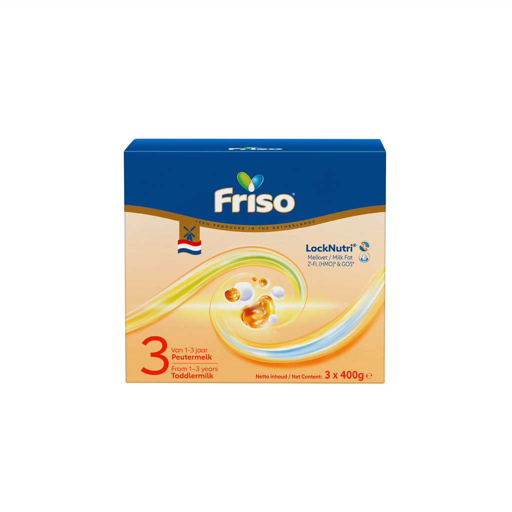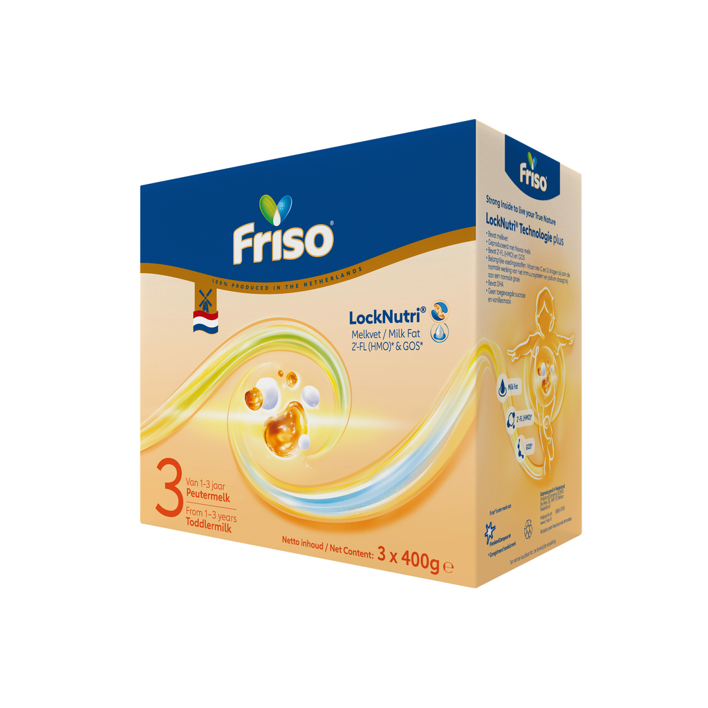 Friso 3 is een opvolgmelk, geschikt voor zuigelingen vanaf 10 maanden en heeft nu een verbeterde receptuur met natuurlijk melkvet. Het bevat voedingsstoffen zoals 2'-FL (HMO), GOS (voedingsvezels), DHA* en AA* (onverzadigde vetzuren) en nucleotiden*. Dit product wordt geproduceerd in Nederland.